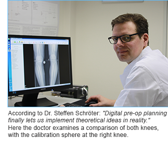 The trauma center in Tübingen is especially fond of the program’s simulation capabilities for corrective osteotomies of deformities. In the past, the axes on the radiograph were measured using a protractor, but now the computer handles this task. It works faster and – more importantly – much more accurately. With a conventional radiograph, analyzing a deformity in detail required a great deal of effort. Only simple methods were available for planning the correction at the tibia head. This resulted in inaccurate planning. But now highly precise planning is possible. Various implants, plates, and angles can be simulated to observe their effects on the geometry of the leg. The surgeon can then compare two or three planning options and choose the most optimal variation for the operation. « The whole process takes maybe a half hour, » according to Dr. Schröter. « This has existed in theory for quite some time, but digital planning now allows us to turn theory into reality. » For osteotomies, correction of collateral ligament instabilities (caused by degraded cartilage, for example) can be simulated. The simulation improves the quality of the operation by accounting for the patient’s individual physiological and anatomical characteristics.