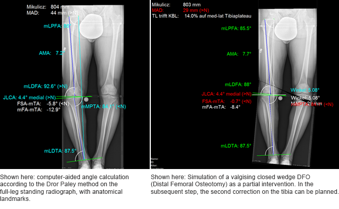 Even joint-specific and nontypical planning, for situations like supramalleolar corrective osteotomies and leg elongations with motorized pins, can be planned and much more. Even more important is simulation of the changes to the joint axes, for example, during distraction.